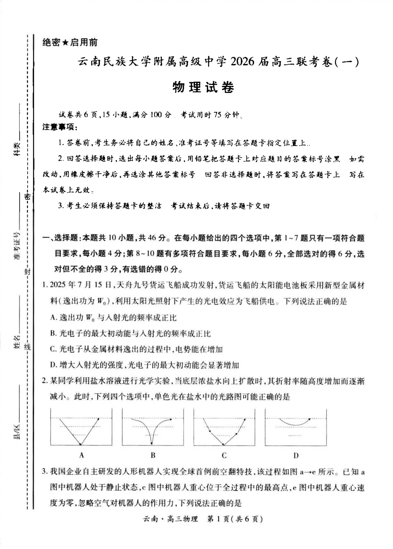 高三物理+答案--云南民族大学附属高级中学2026届高三上学期联考(一)