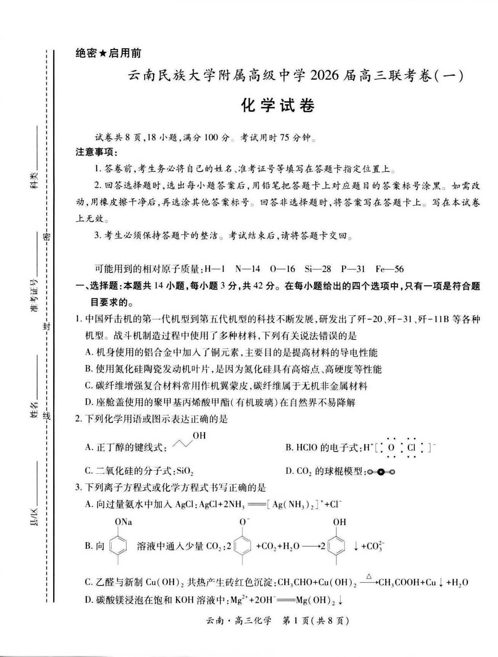 高三化学+答案--云南民族大学附属高级中学2026届高三上学期联考(一)