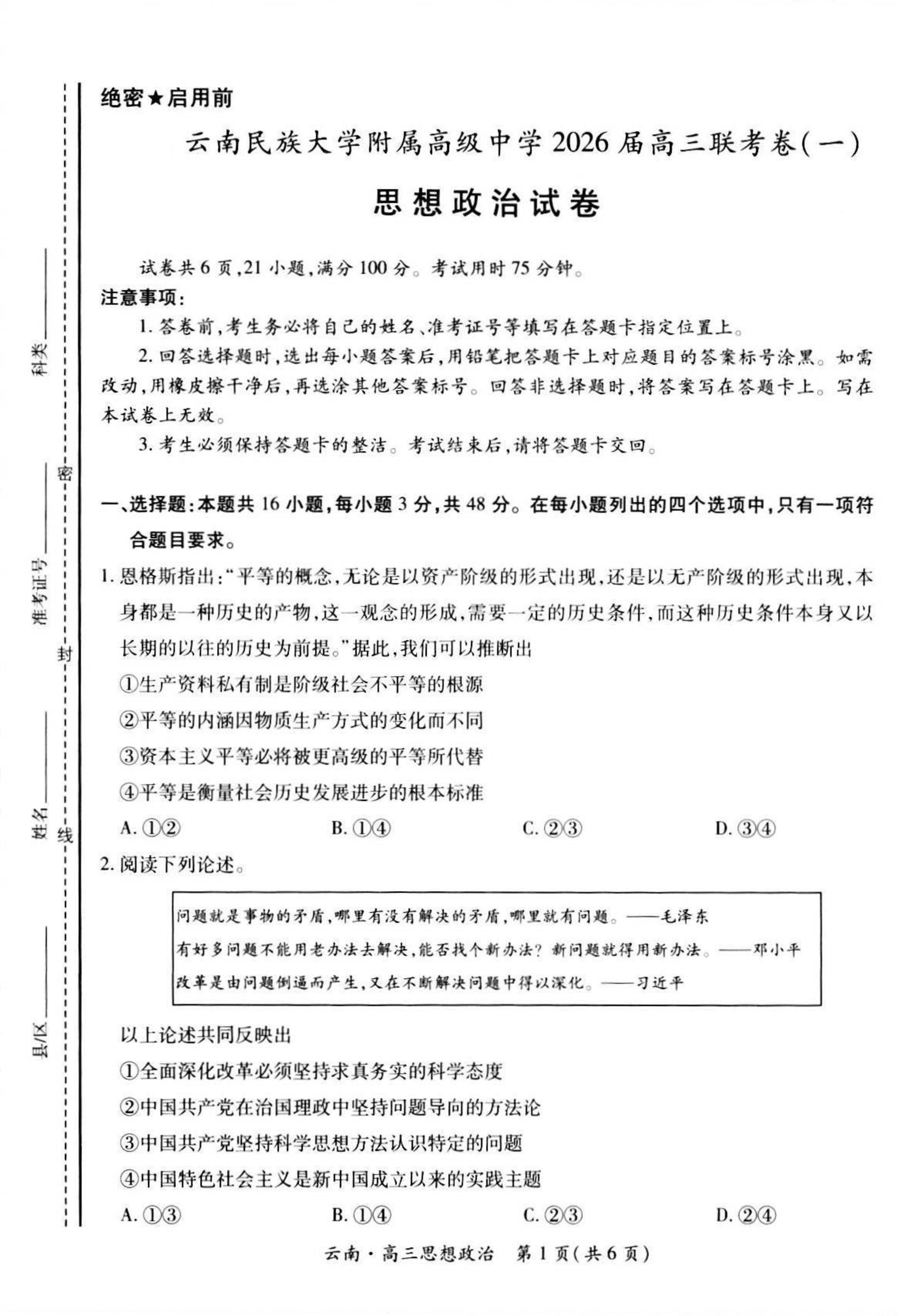 高三政治+答案--云南民族大学附属高级中学2026届高三上学期联考(一)