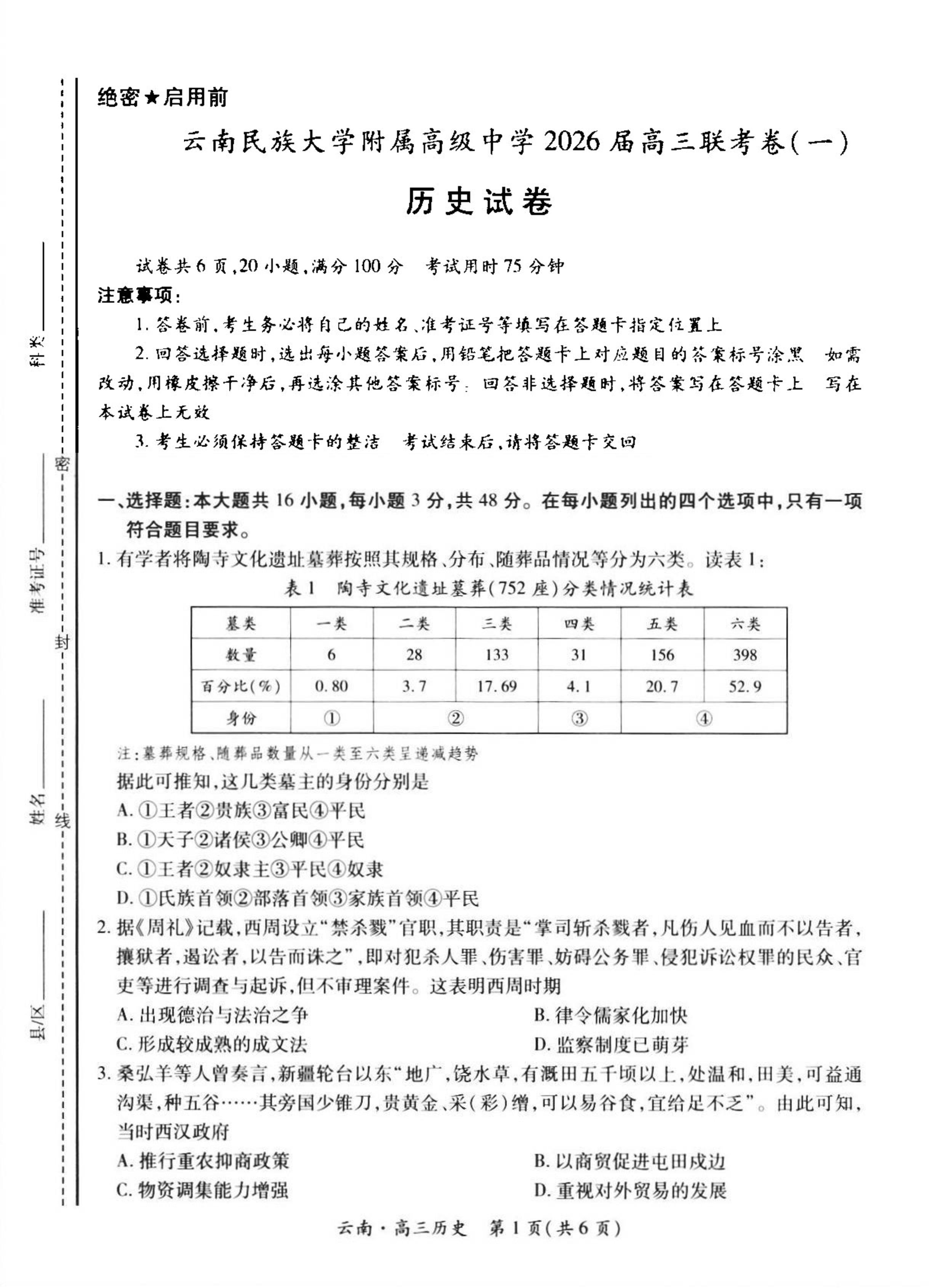 高三历史+答案--云南民族大学附属高级中学2026届高三上学期联考(一)