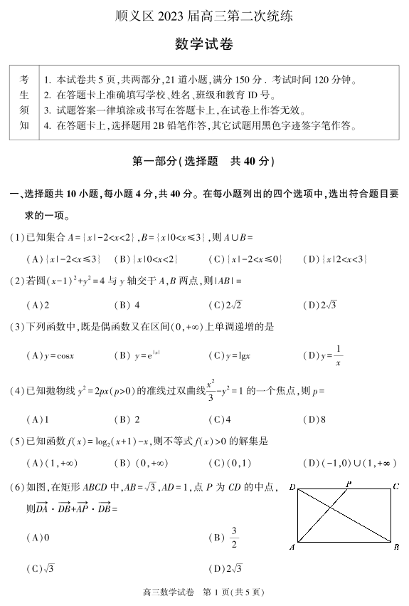 高三数学+答案--北京市顺义区2023高三第二次统练