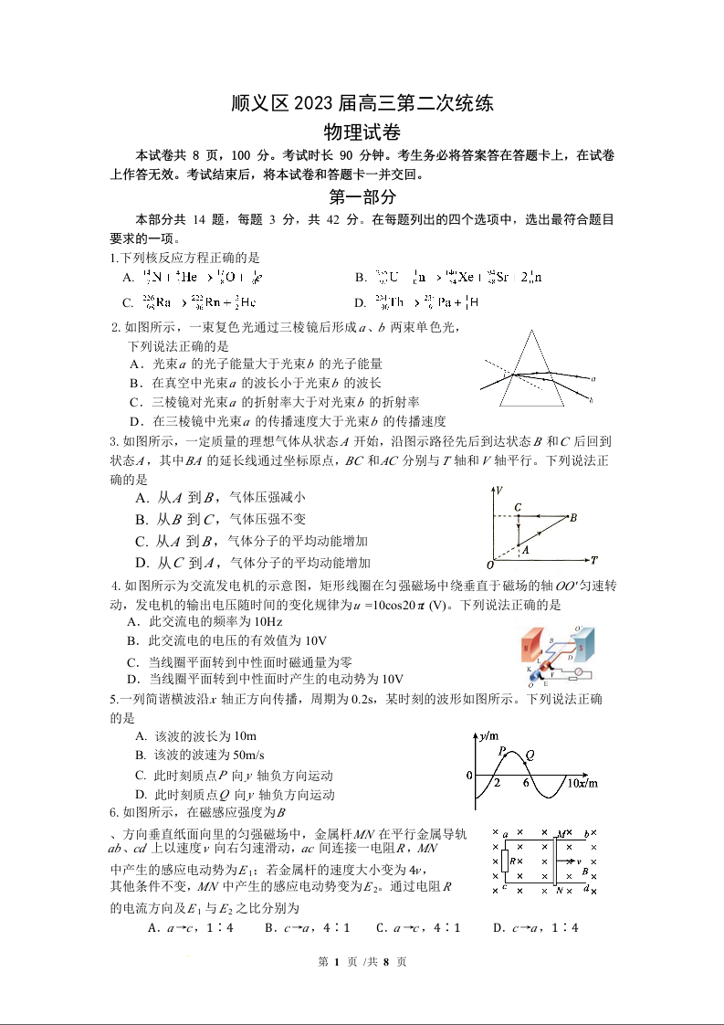 高三物理--北京市顺义区2023高三第二次统练
