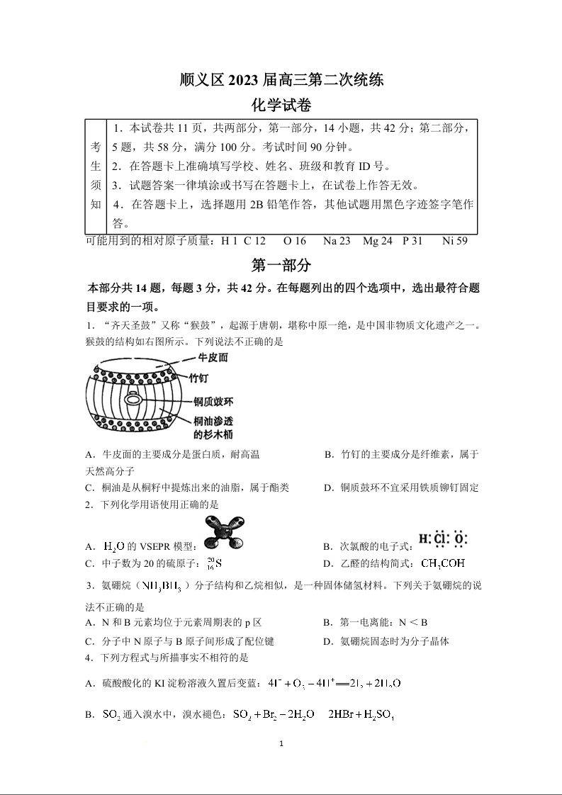 高三化学--北京市顺义区2023高三第二次统练