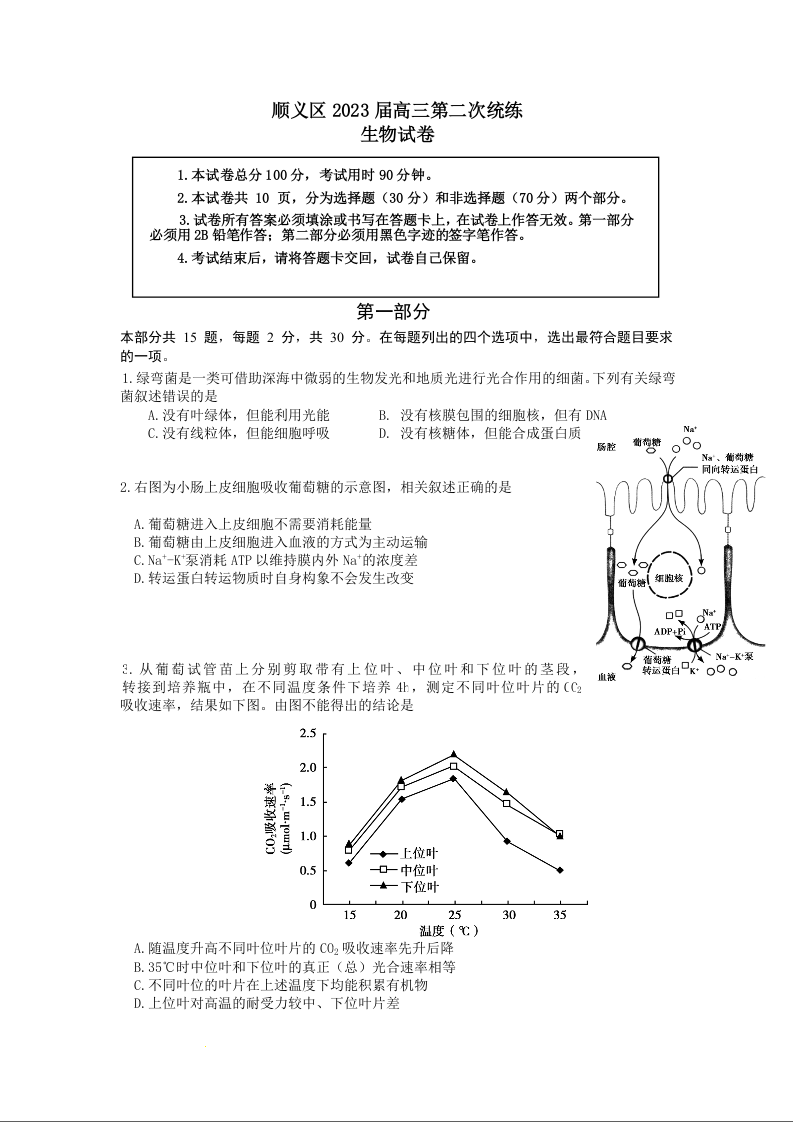 高三生物--北京市顺义区2023高三第二次统练