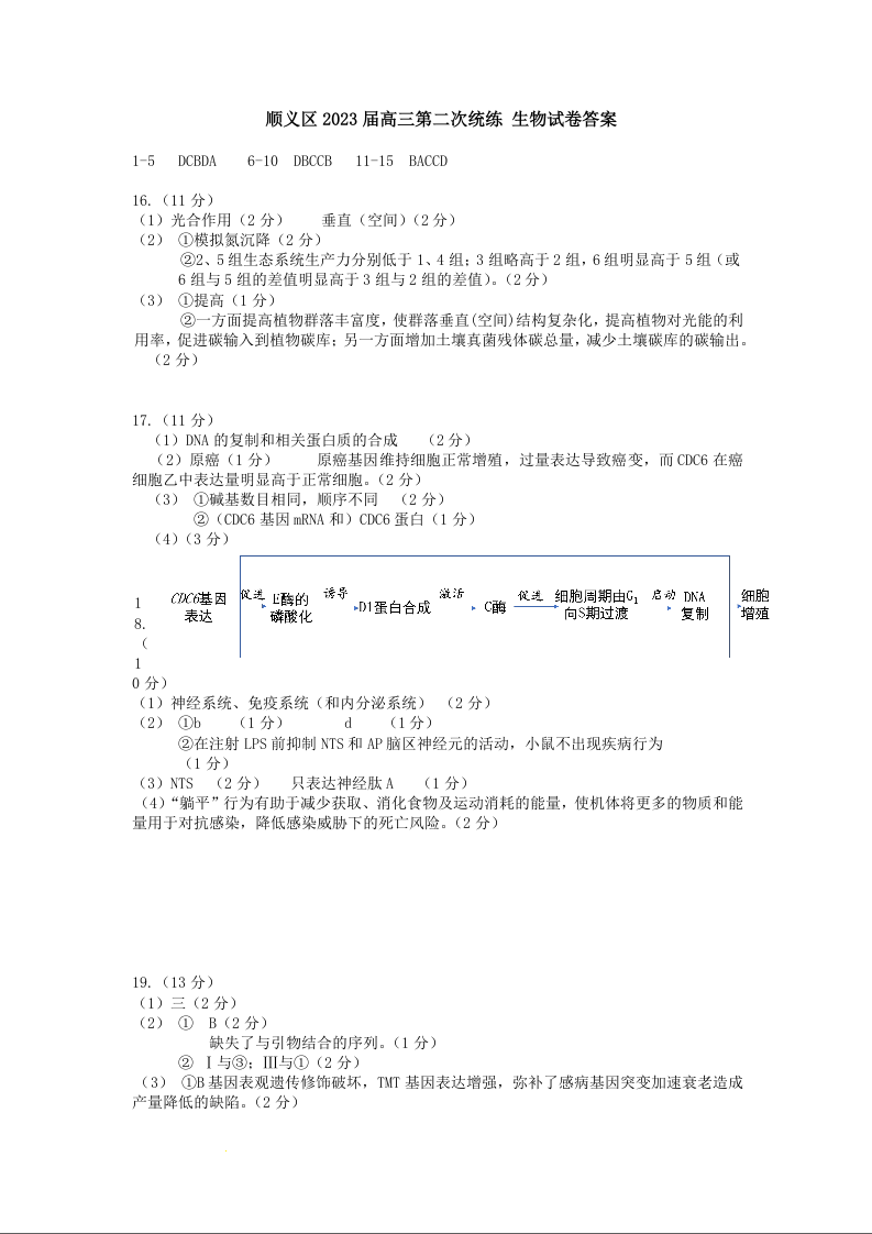 高三生物答案--北京市顺义区2023高三第二次统练