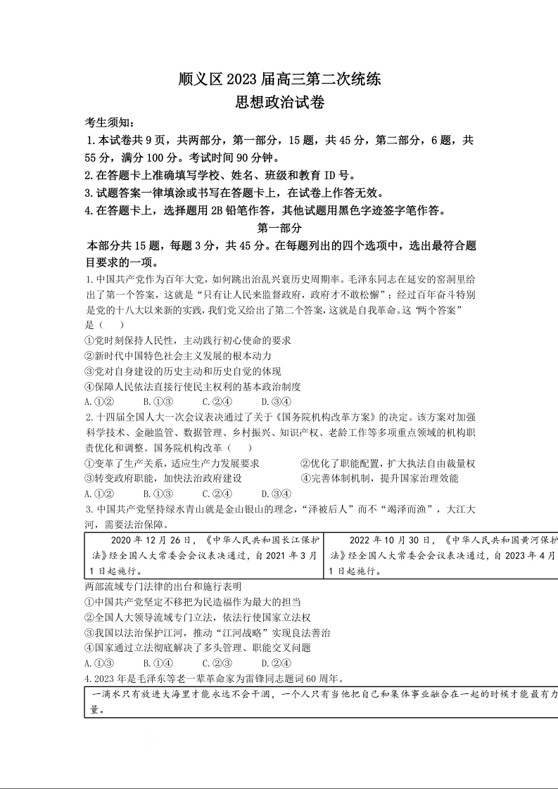 高三政治+答案--北京市顺义区2023高三第二次统练