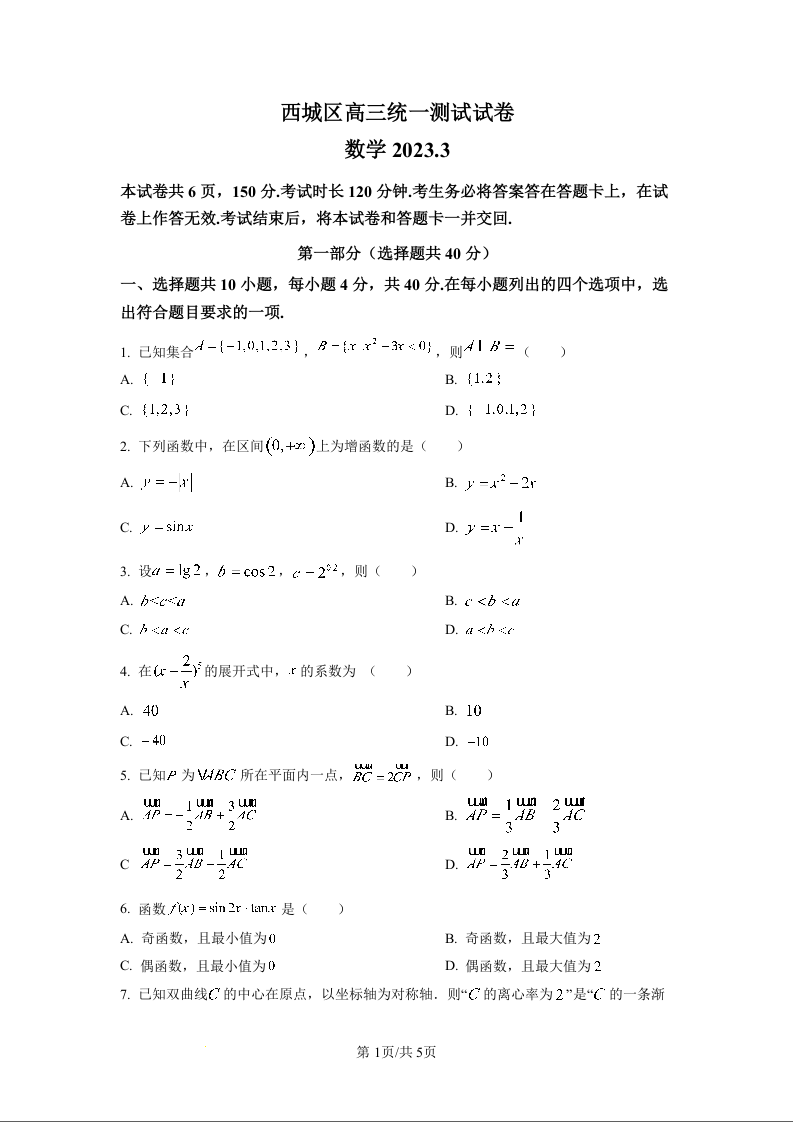 高三数学(原卷版)--北京市西城区2023高三一模