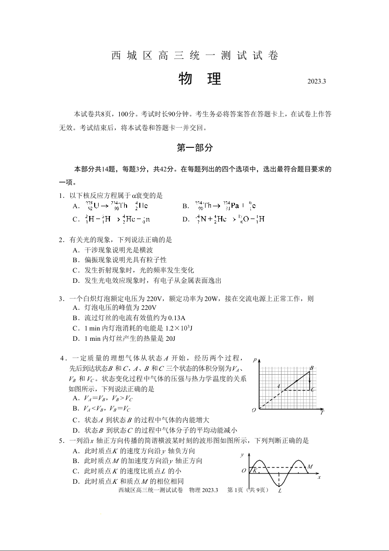 高三物理--北京市西城区2023高三一模