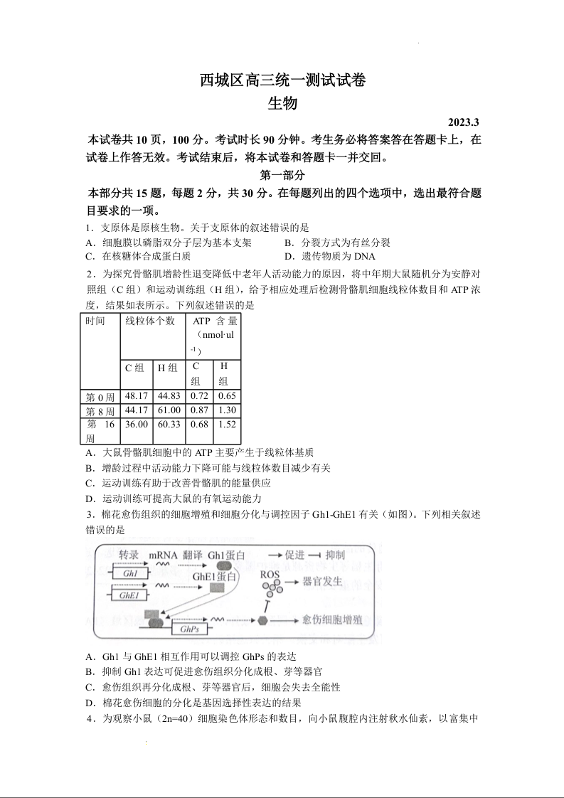 高三生物--北京市西城区2023高三一模