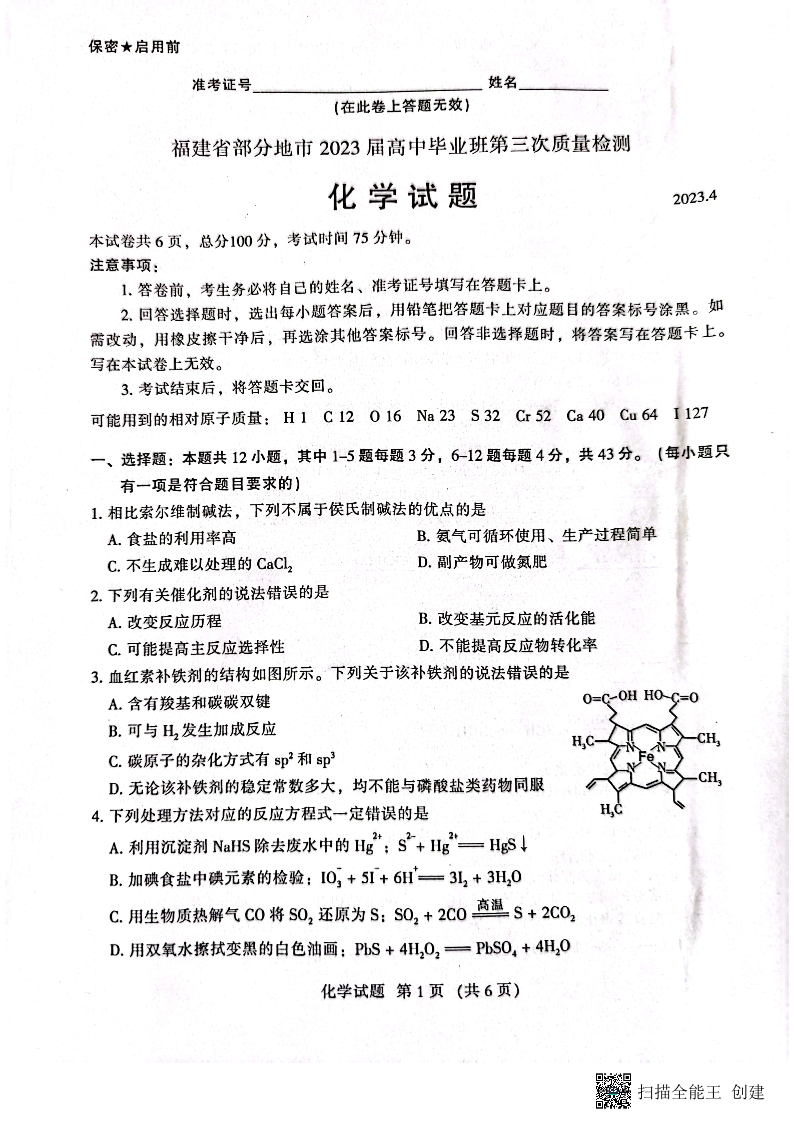 高三化学--福建省2023高中毕业班4月适应性练习