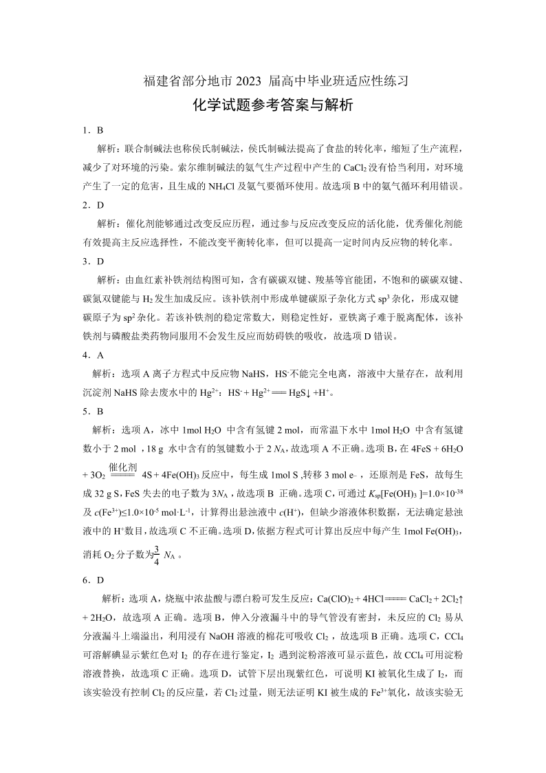 高三化学答案--福建省2023高中毕业班4月适应性练习