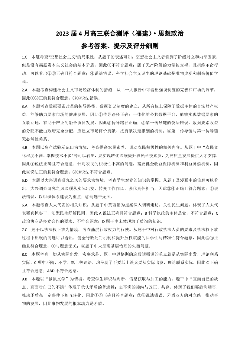 高三政治答案--福建省2023届高三4月联合测评百校联盟