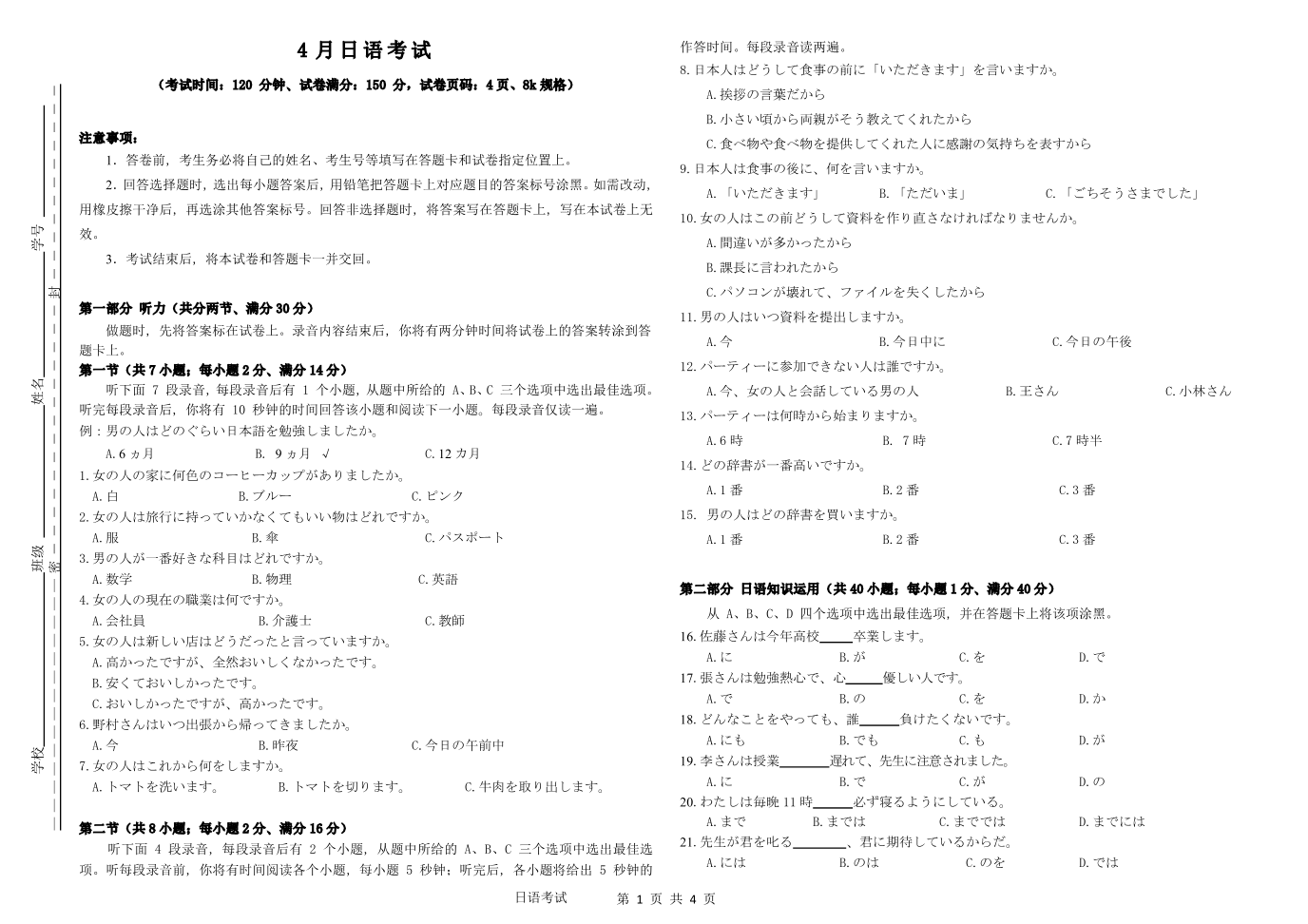 高三日语--福建省2023届高三4月联合测评百校联盟