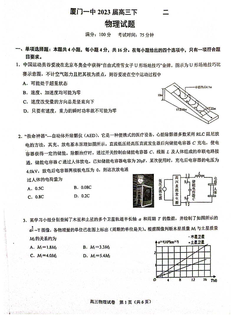 高三物理+答案--福建省厦门第一中学2023高三二模