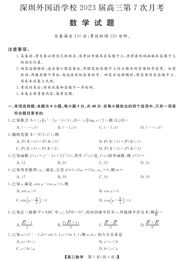 高三数学--广东省深圳外国语学校2023届高三第7次月考