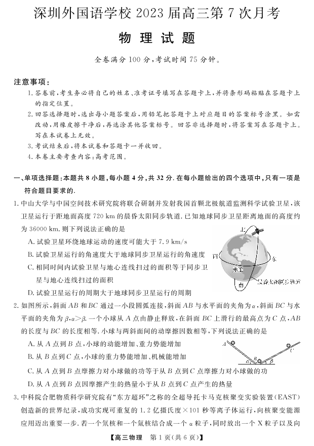 高三物理--广东省深圳外国语学校2023届高三第7次月考
