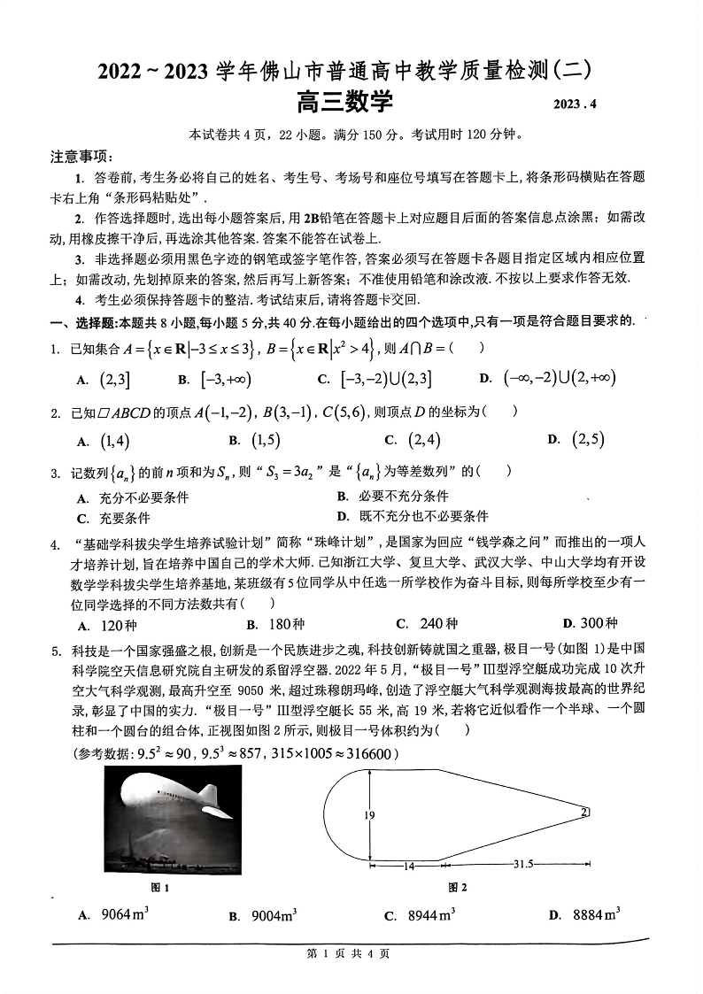 高三数学--广东省佛山市2023届普通高中教学质量检测(二)(佛山二模)