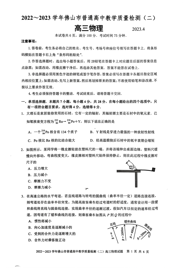 高三物理--广东省佛山市2023届普通高中教学质量检测(二)(佛山二模)