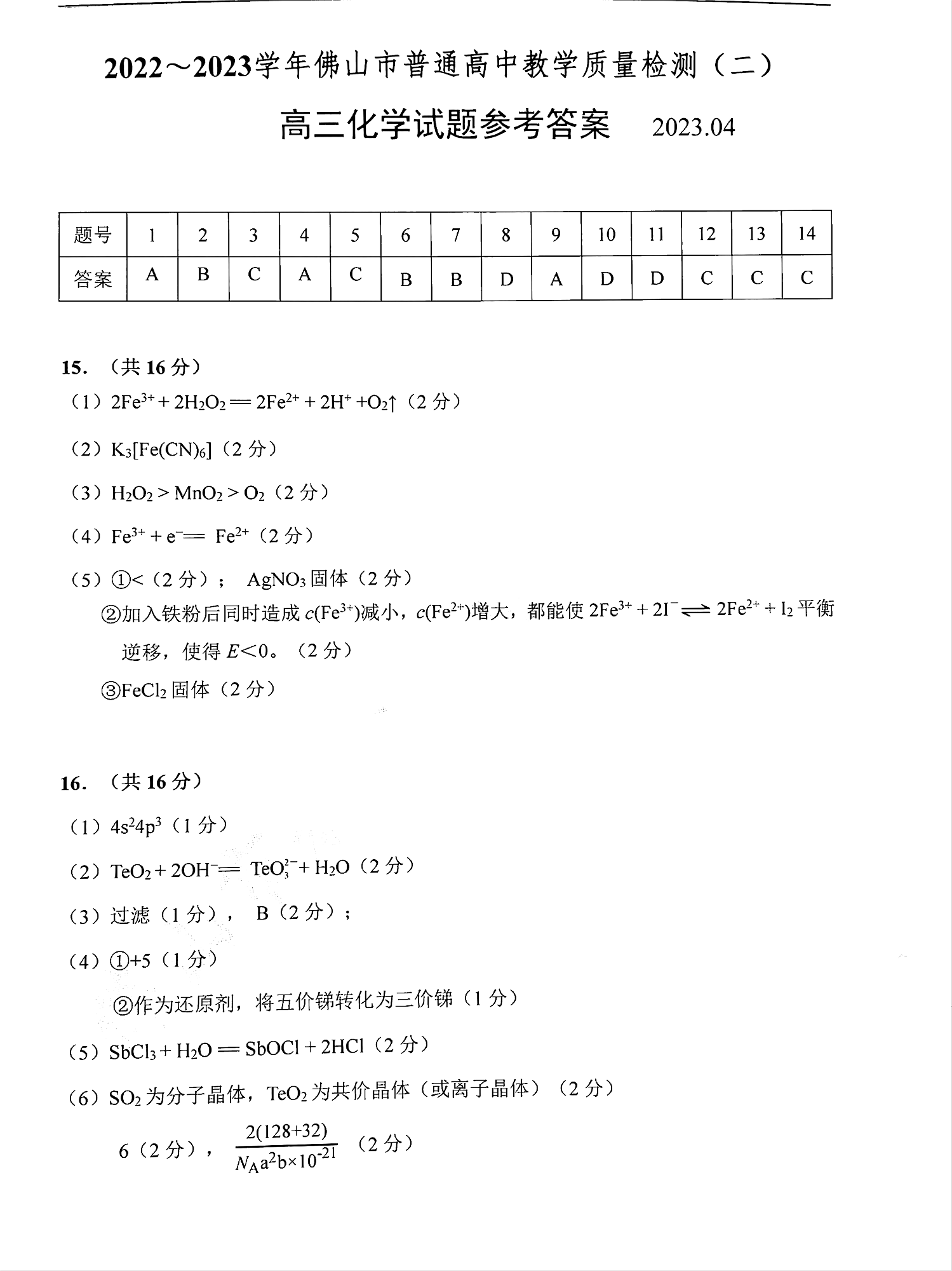 高三化学答案--广东省佛山市2023届普通高中教学质量检测(二)(佛山二模)