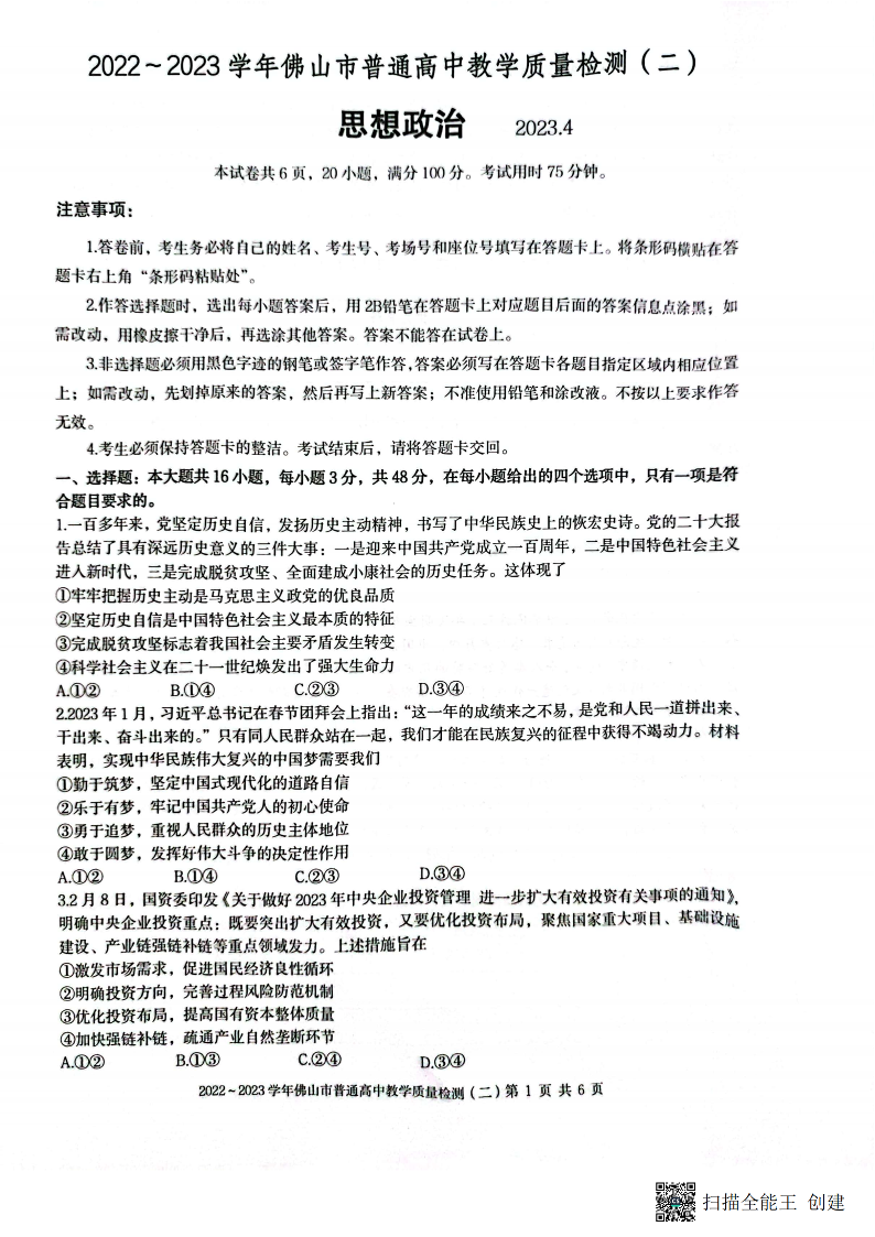 高三政治--广东省佛山市2023届普通高中教学质量检测(二)(佛山二模)