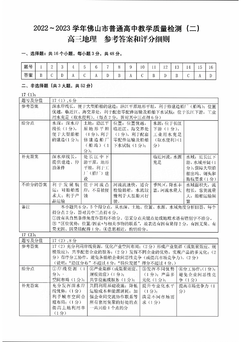 高三地理答案--广东省佛山市2023届普通高中教学质量检测(二)(佛山二模)