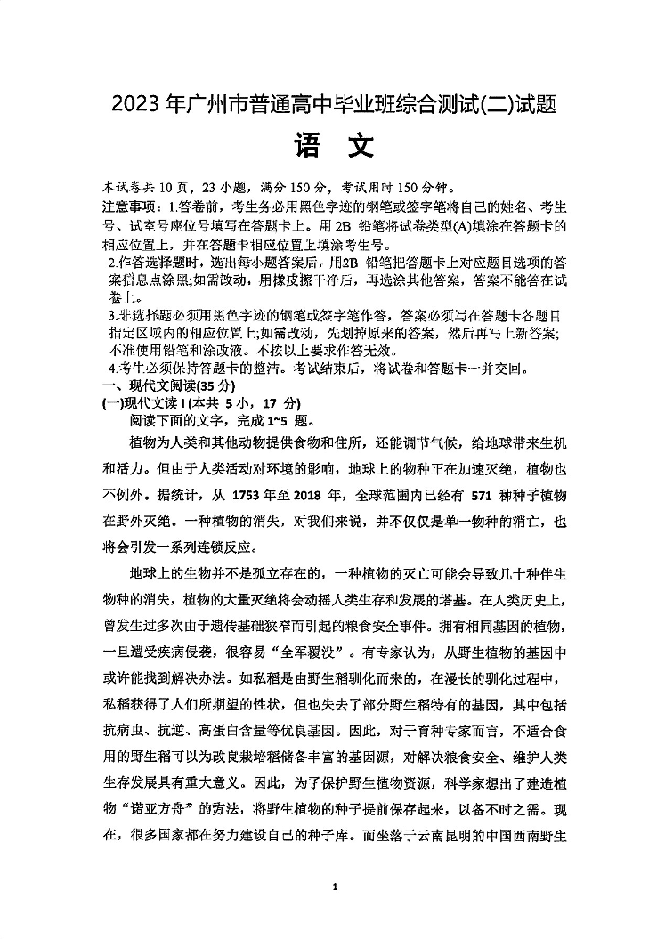 高三语文--广东省广州市2023年普通高中毕业班综合测试(二)(广州二模