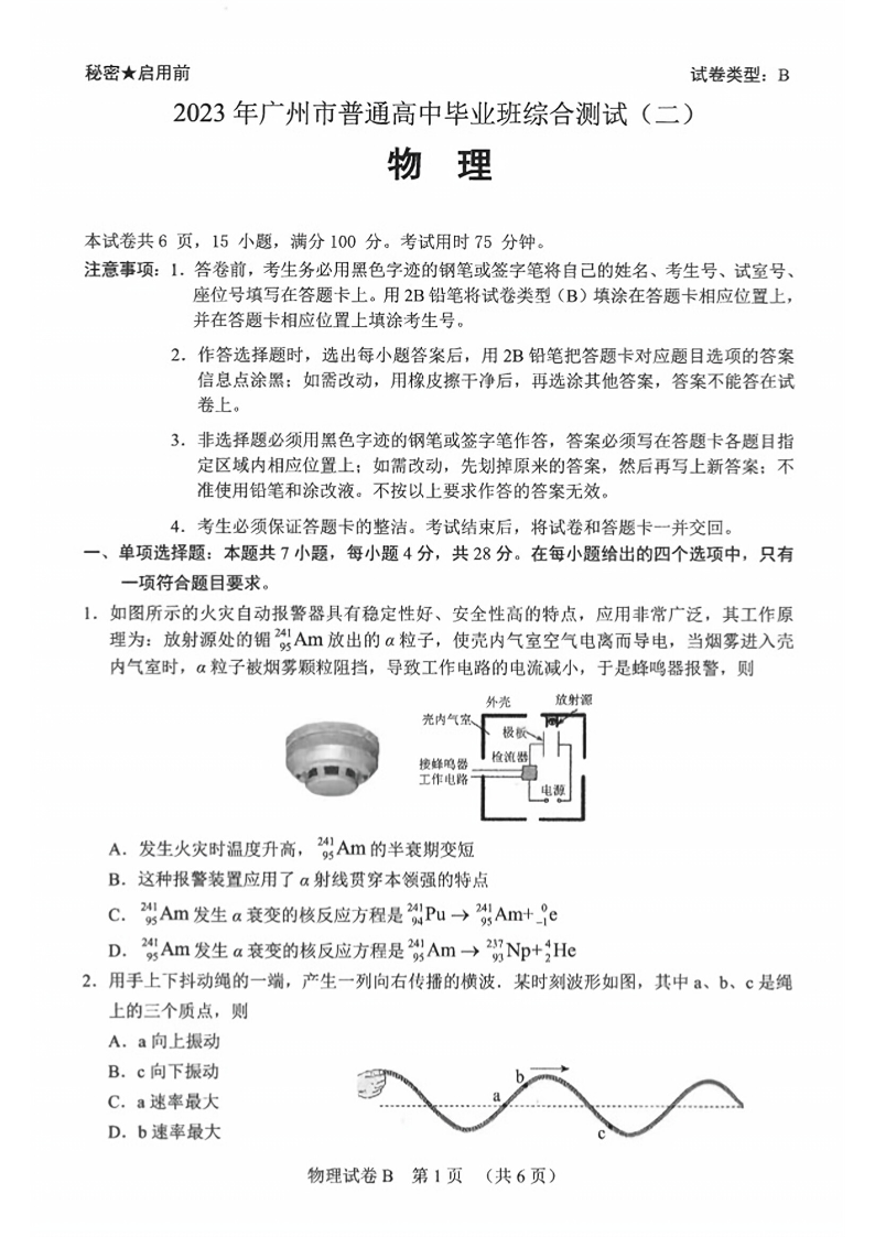 高三物理--广东省广州市2023年普通高中毕业班综合测试(二)(广州二模