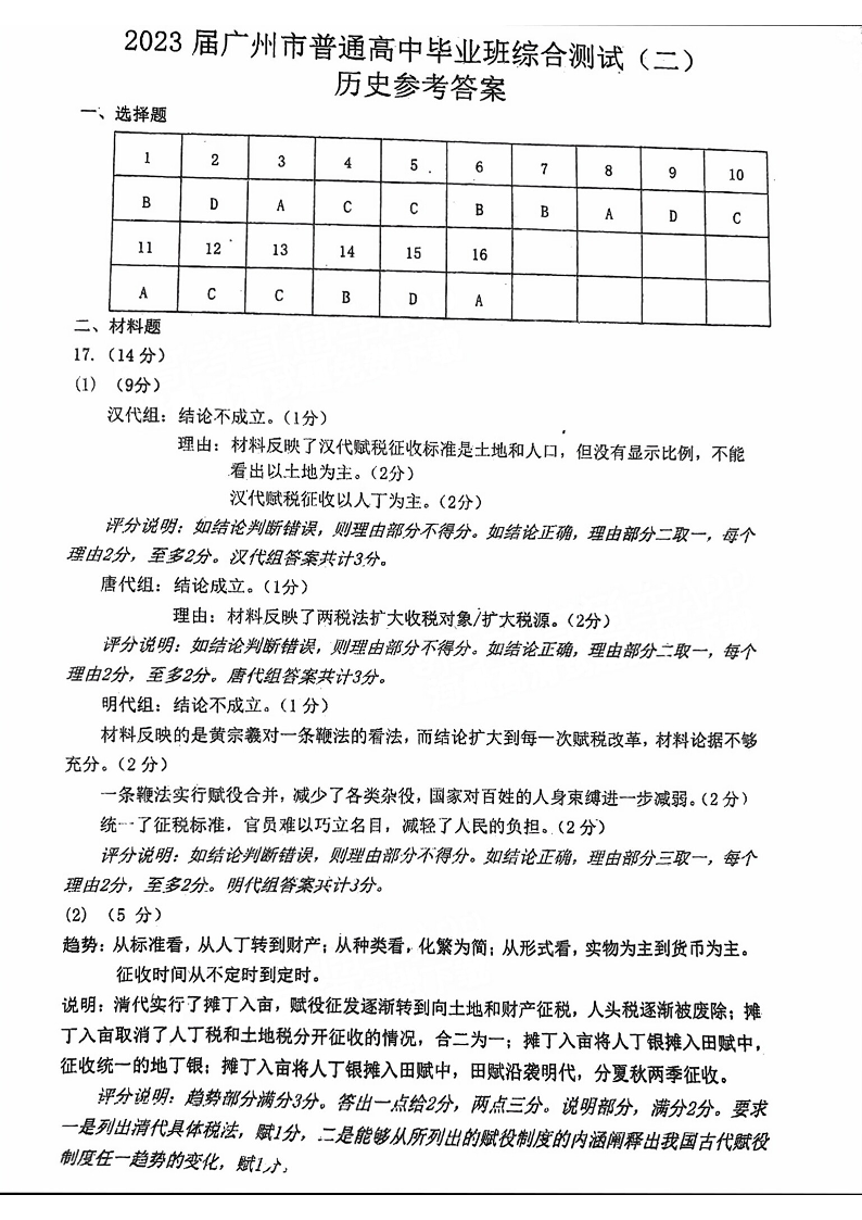 高三历史答案--广东省广州市2023年普通高中毕业班综合测试(二)(广州二模