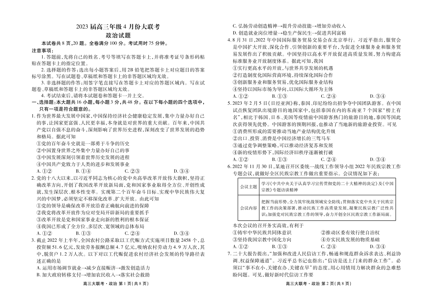 高三政治--广东省衡水金卷2023届高三年级4月份大联考