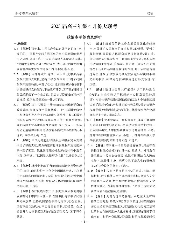 高三政治答案--广东省衡水金卷2023届高三年级4月份大联考