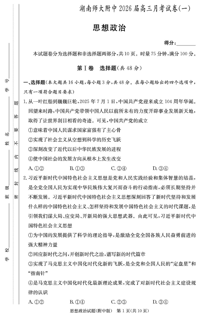 高三政治--湖南师范大学附属中学2026届高三上学期8月月考(一)