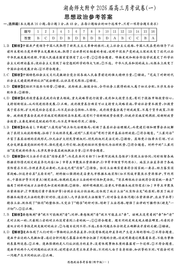 高三政治答案--湖南师范大学附属中学2026届高三上学期8月月考(一)