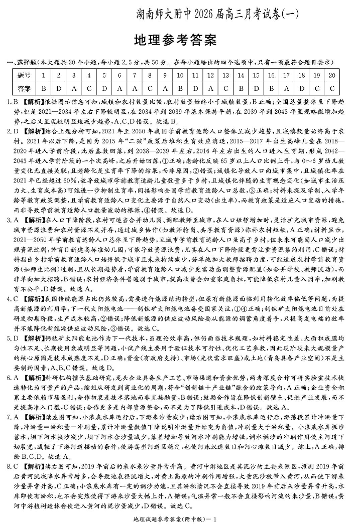 高三地理答案--湖南师范大学附属中学2026届高三上学期8月月考(一)