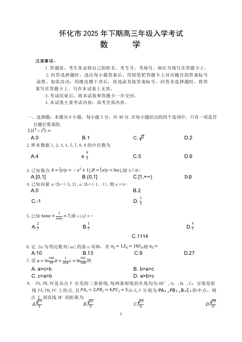 高三数学--湖省怀化市2026届高三上学期8月金太阳开学考试
