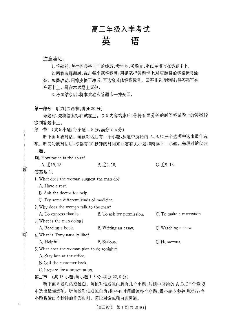 高三英语--湖南省怀化市2026届高三上学期8月金太阳开学考试