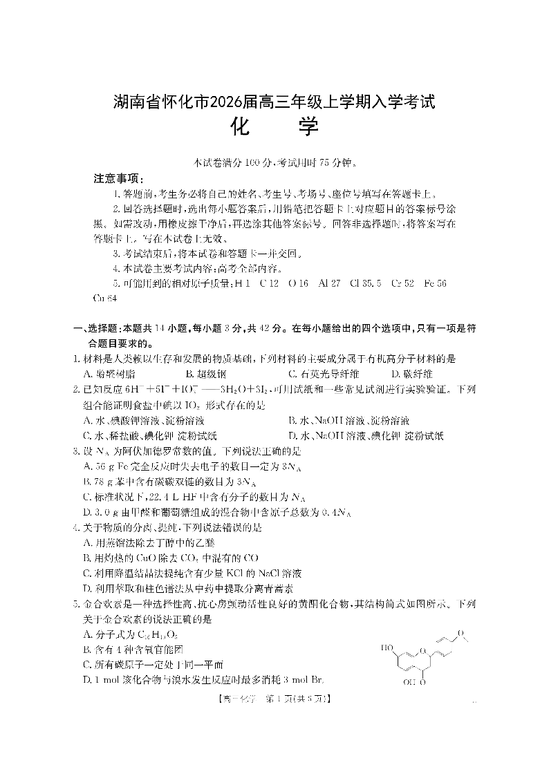 高三化学--湖南省怀化市2026届高三上学期8月金太阳开学考试