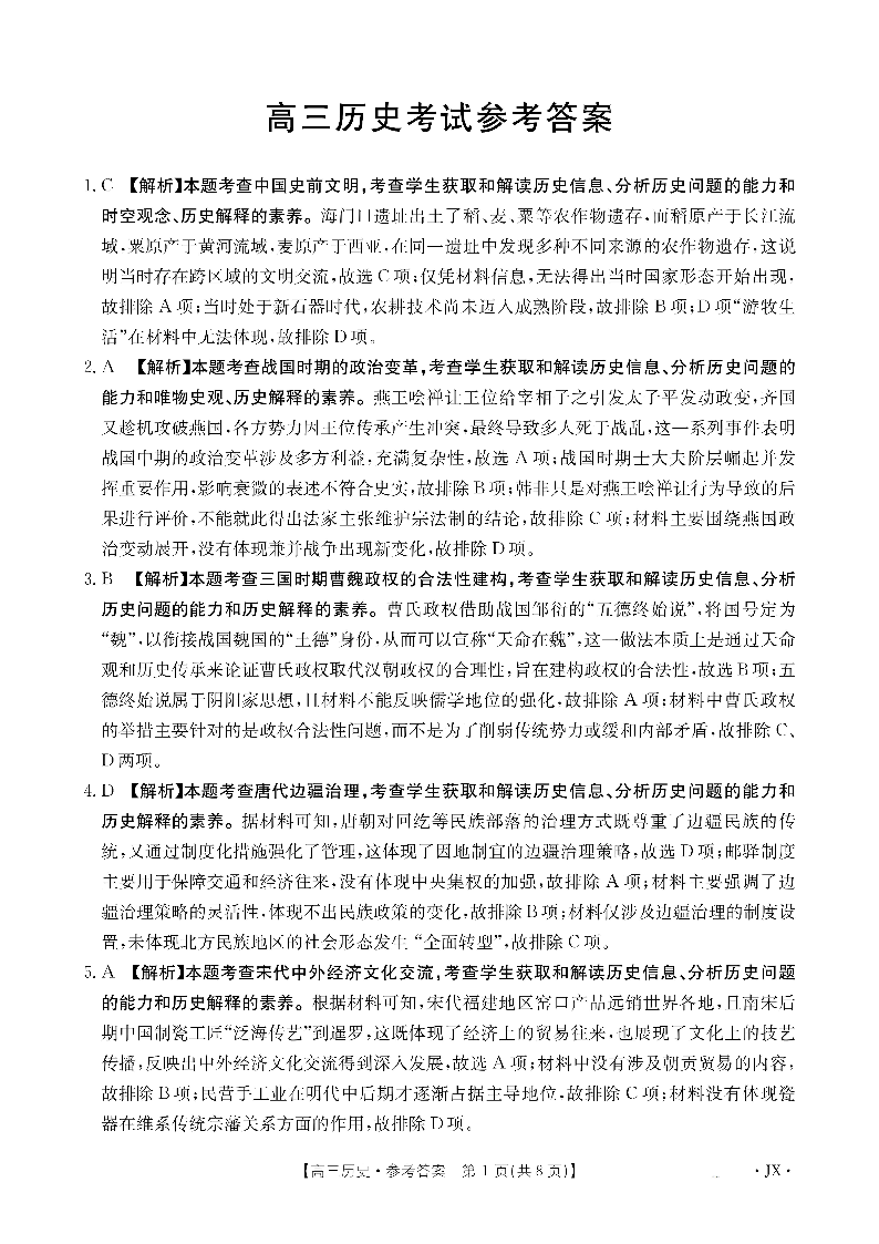 高三历史答案--江西省2026届高三上学期8月百万金太阳大联考