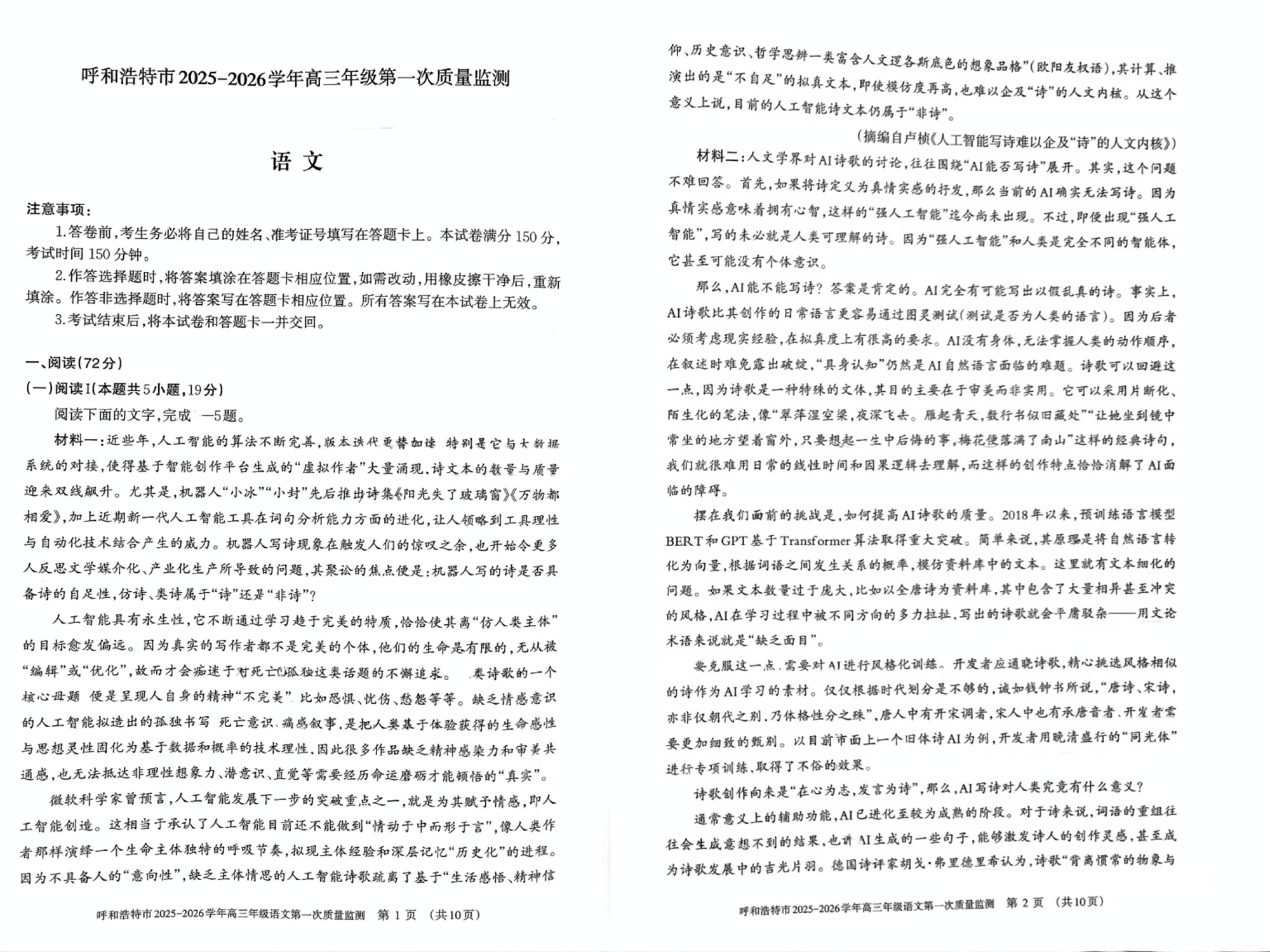 高三语文--内蒙古呼和浩特市2026届高三年级第一次质量监测