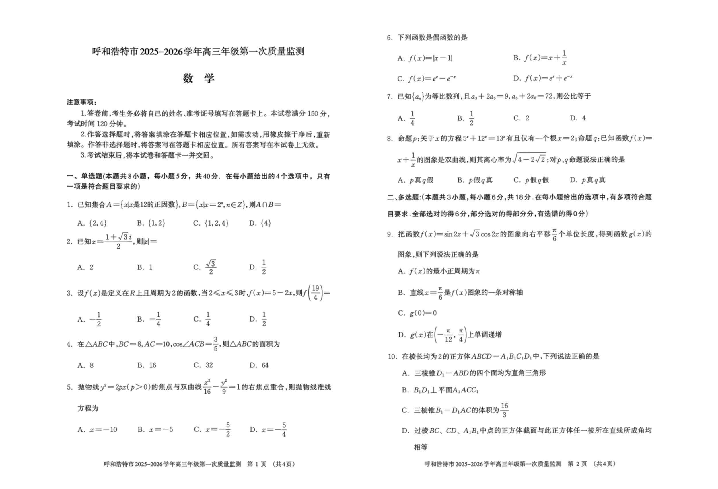 高三数学--内蒙古呼和浩特市2026届高三年级第一次质量监测