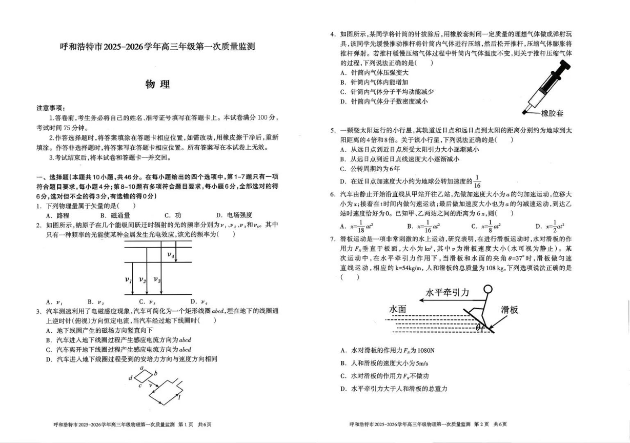 高三物理--内蒙古呼和浩特市2026届高三年级第一次质量监测