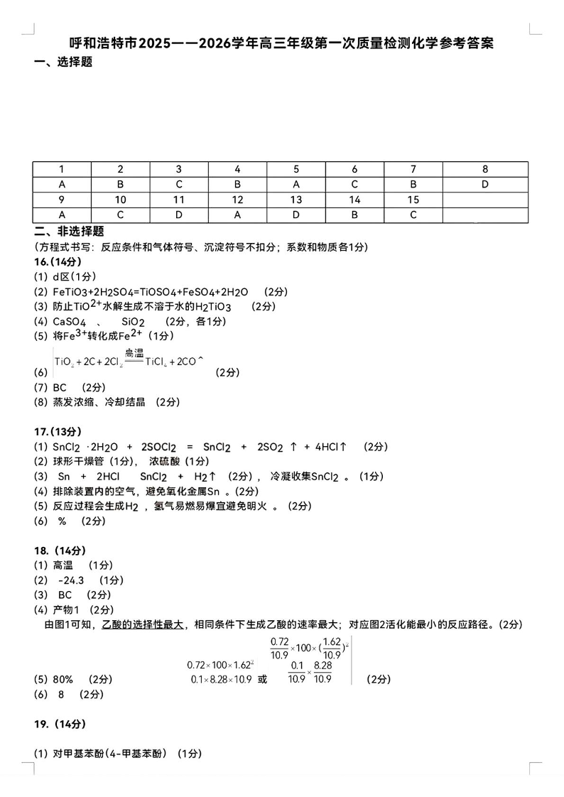 高三化学答案--内蒙古呼和浩特市2026届高三年级第一次质量监测