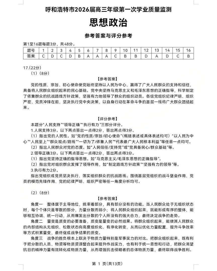 高三政治答案--内蒙古呼和浩特市2026届高三年级第一次质量监测