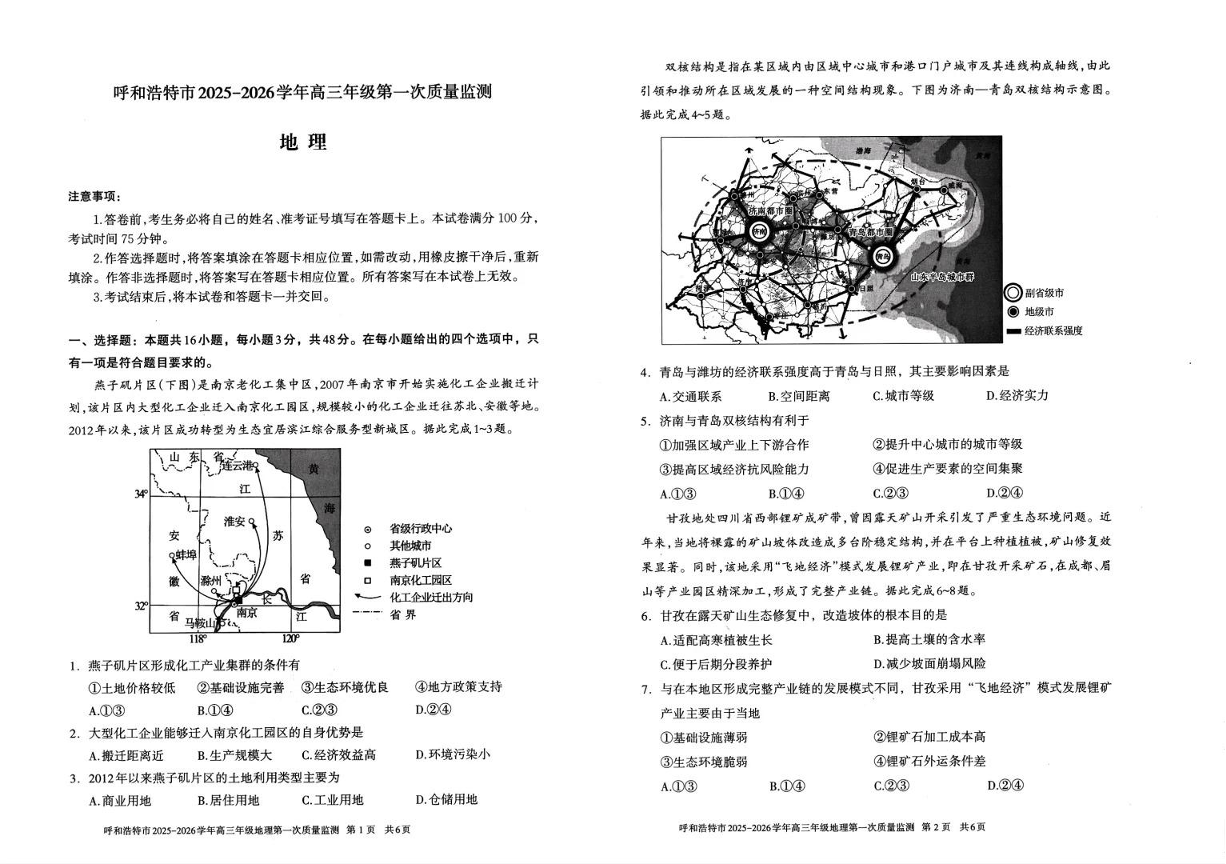 高三地理--内蒙古呼和浩特市2026届高三年级第一次质量监测