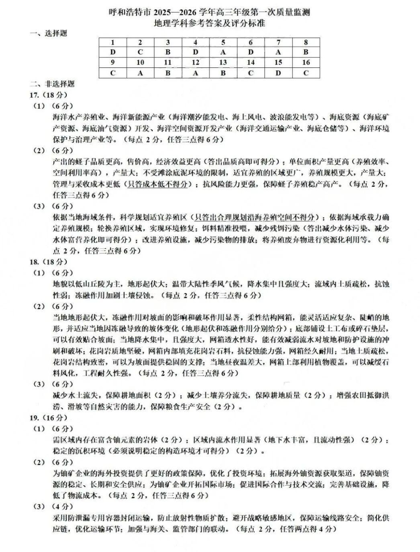 高三地理答案--内蒙古呼和浩特市2026届高三年级第一次质量监测
