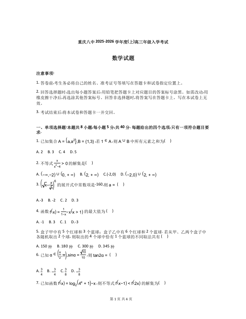 高三数学--重庆八中2025—2026 学年度(上)高三年级8月入学考试