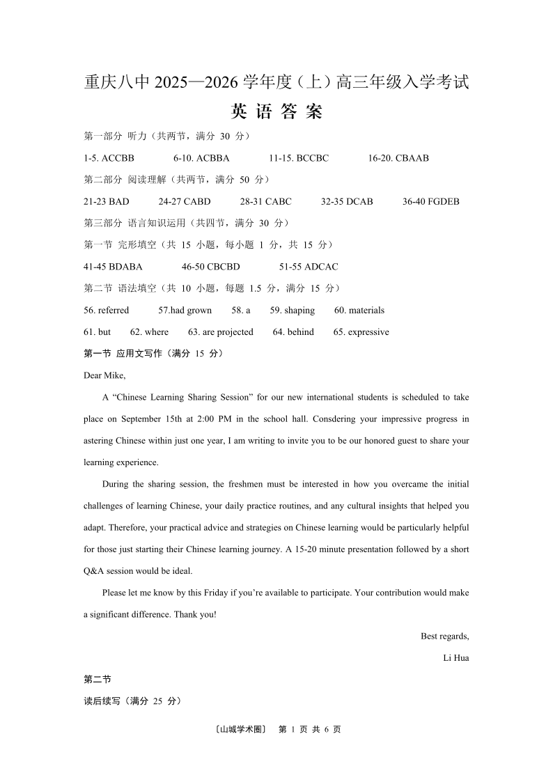 高三英语答案--重庆八中2025—2026 学年度(上)高三年级8月入学考试
