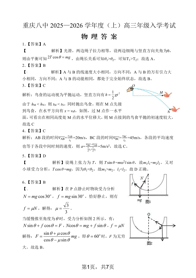 高三物理答案--重庆八中2025—2026 学年度(上)高三年级8月入学考试