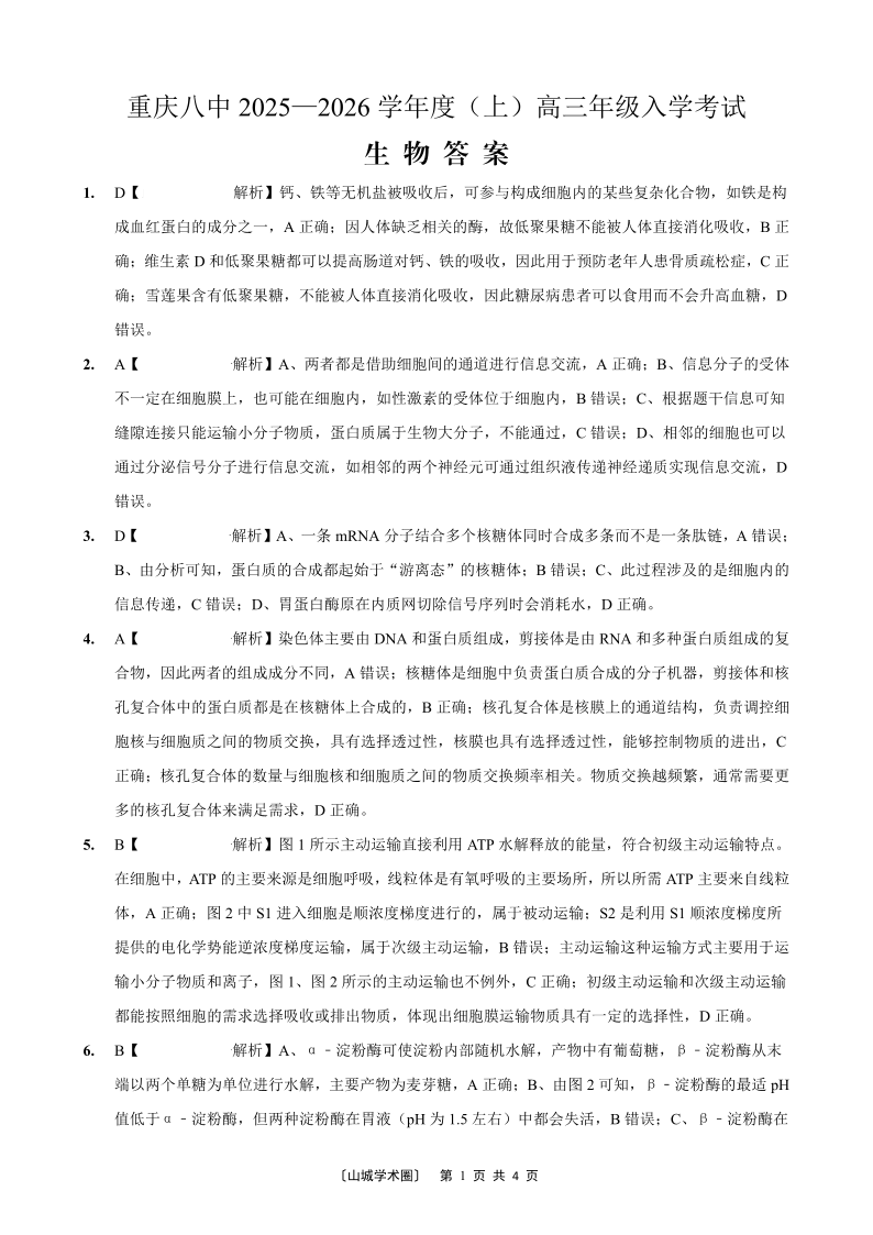 高三生物答案--重庆八中2025—2026 学年度(上)高三年级8月入学考试