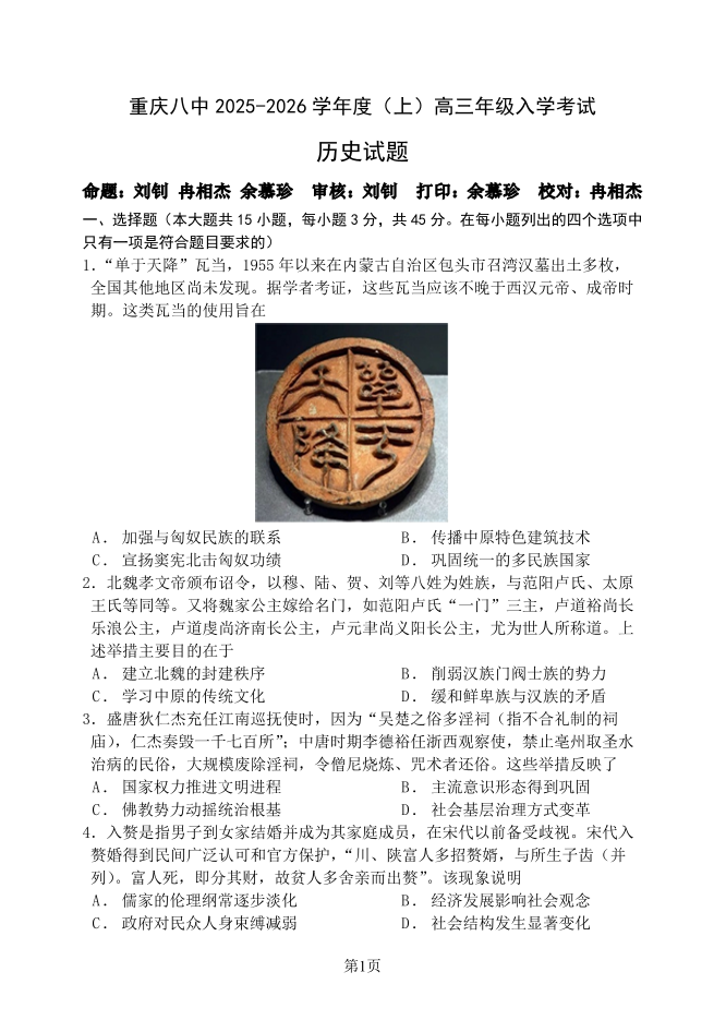高三历史--重庆八中2025—2026 学年度(上)高三年级8月入学考试