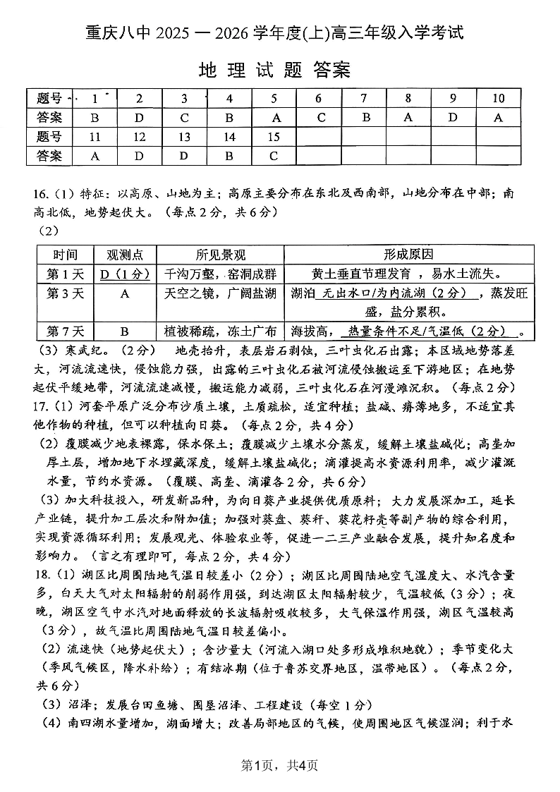 高三地理答案--重庆八中2025—2026 学年度(上)高三年级8月入学考试